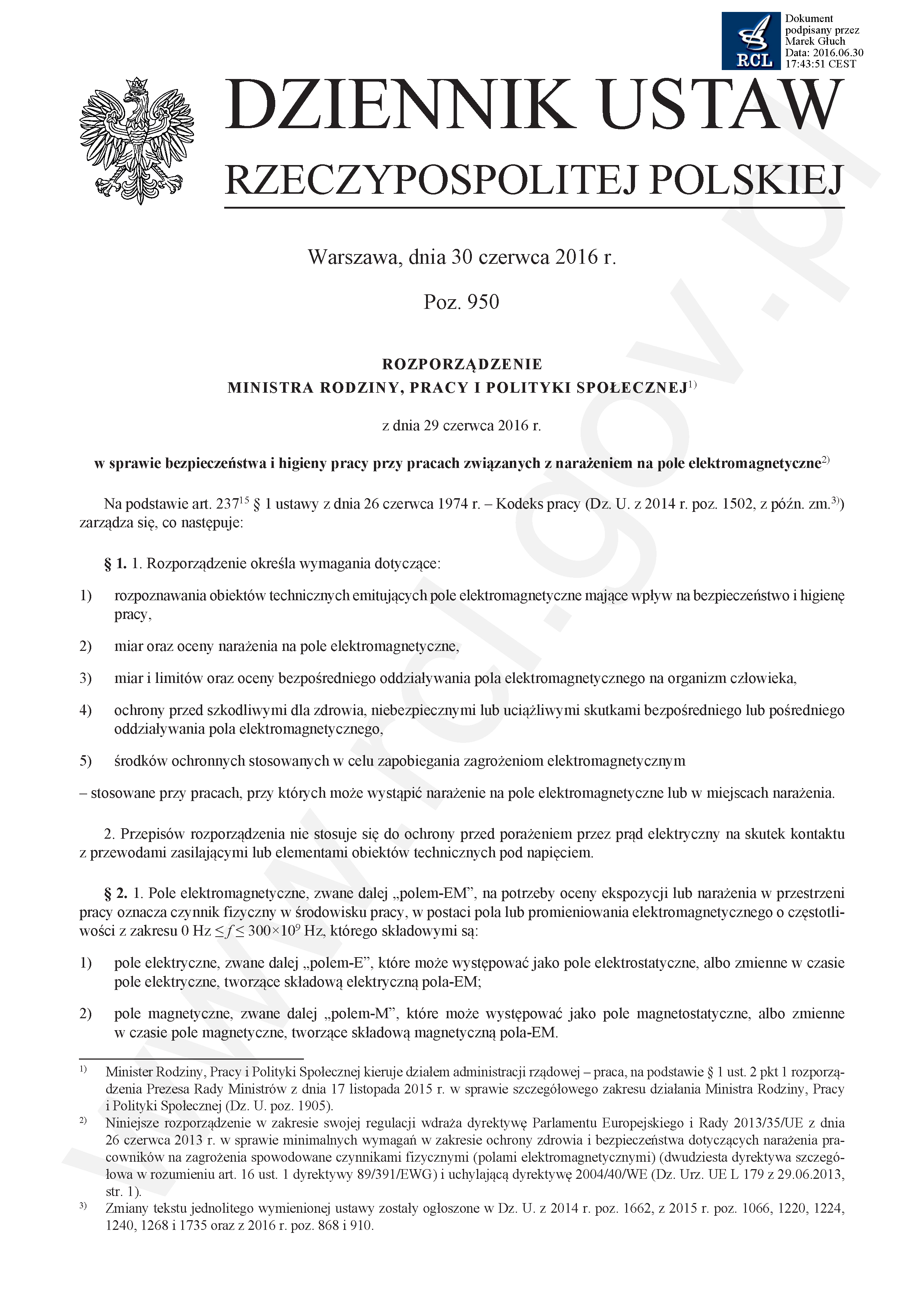W przepisach prawnych dotyczących zarówno ochrony pracowników, jak też środowiska wokół nas, przez pole elektromagnetyczne rozumie się wszelkie emisje elektromagnetyczne od napięć i prądów o częstotliwościach od 0 Hz do 300 GHz. Jak z tego wynika, definicję spełniają:
